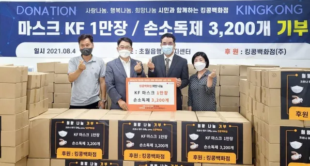 광주시 소재한 ㈜킹콩백화점(회장 이복주)은 지난 4일 광주시 초월읍 행정복지센터를 방문, 어려운 이웃에게 전해 달라며 마스크(KF94) 1만장과 휴대용 손소독제 3천200개를 기탁했다.